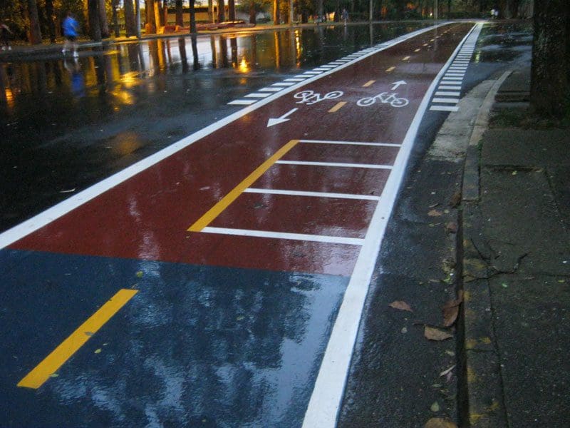 O piso da ciclovia é todo pintado, mas os blocos de concreto da via são de encaixe, então você sente cada vez que passa numa junção durante todo o percurso, sem suspensão e luva deve ser um martírio completar os 12 km de ida e os 12 de volta.