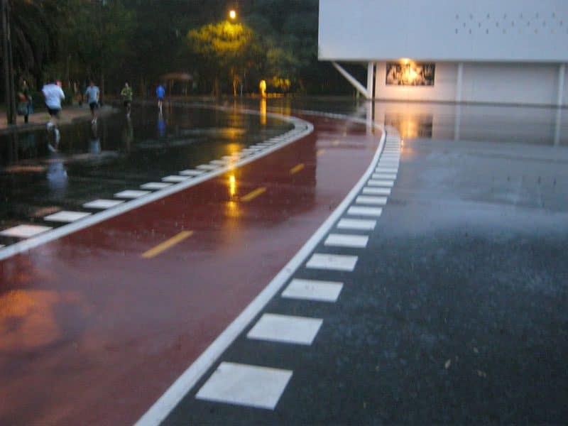 O piso da ciclovia é todo pintado, mas os blocos de concreto da via são de encaixe, então você sente cada vez que passa numa junção durante todo o percurso, sem suspensão e luva deve ser um martírio completar os 12 km de ida e os 12 de volta.