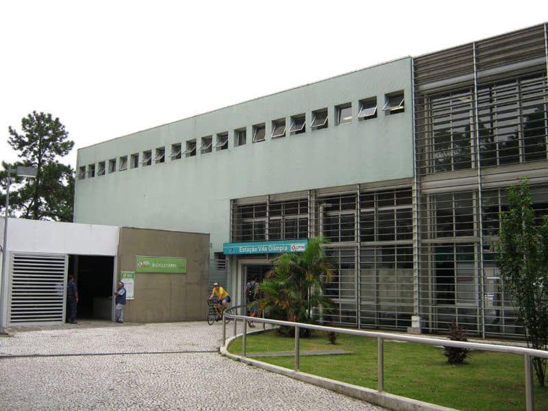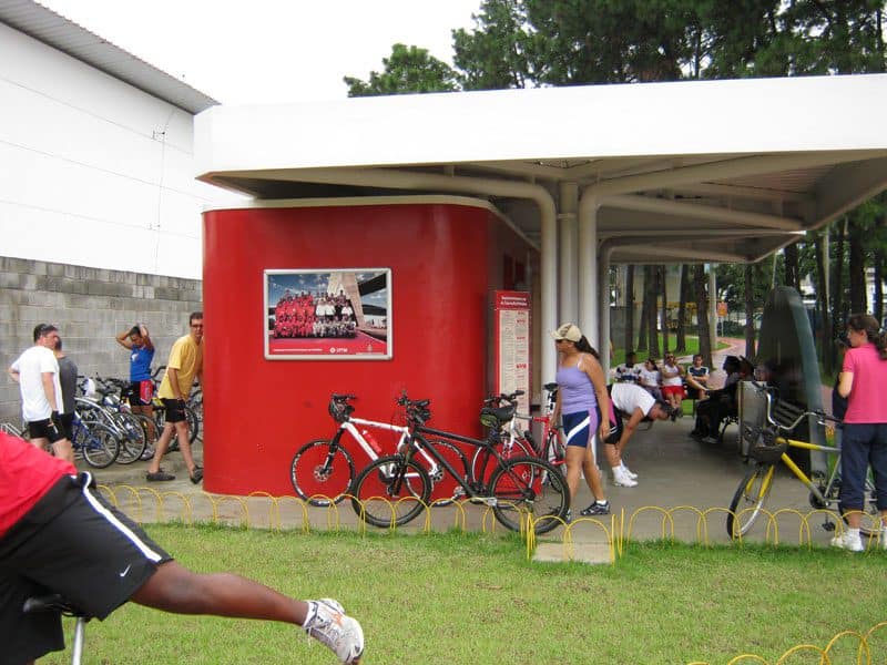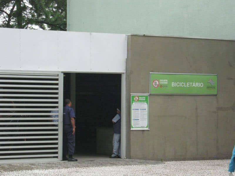 Na entrada da estação esta localizado um bicicletário, bem grande e lotado de bikes.