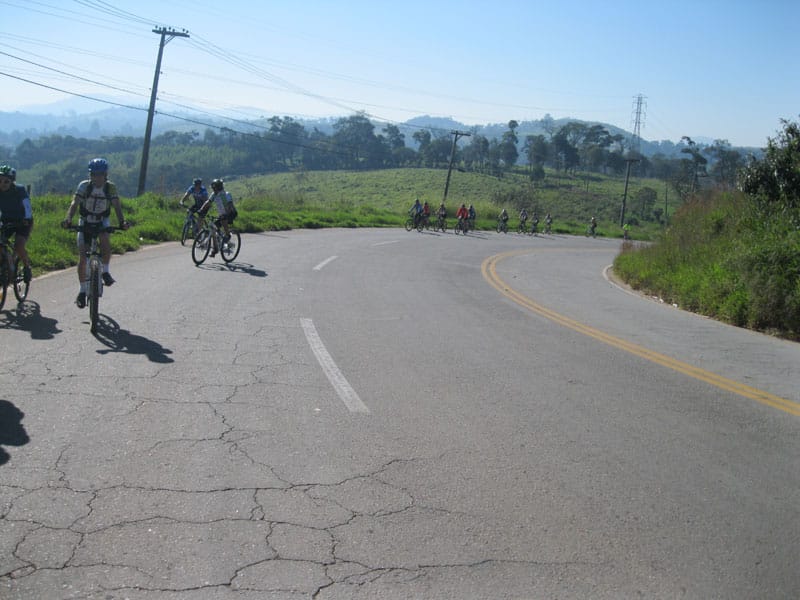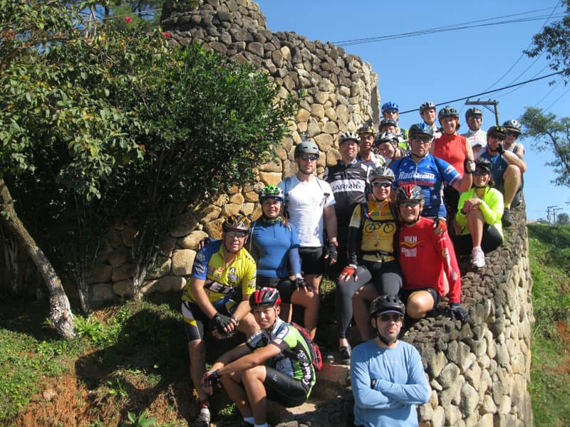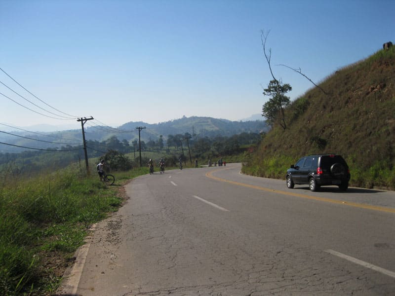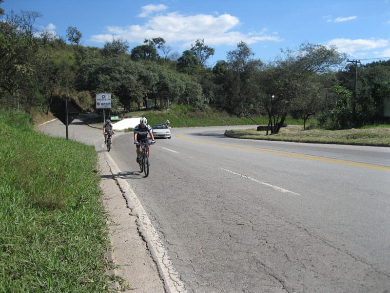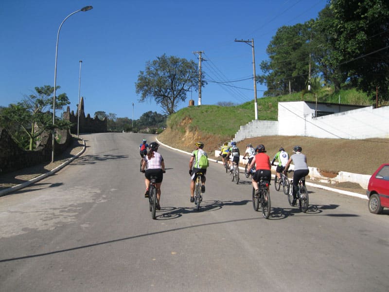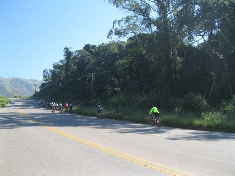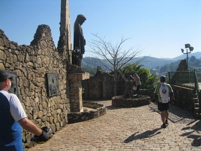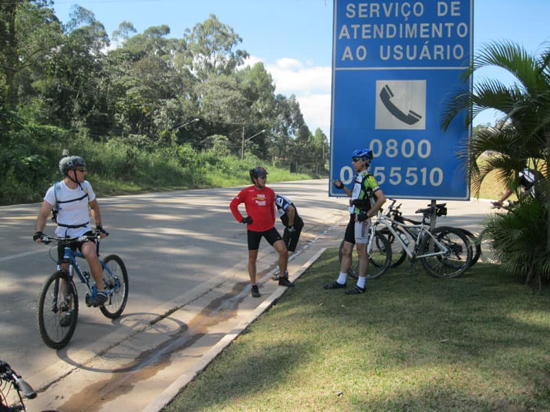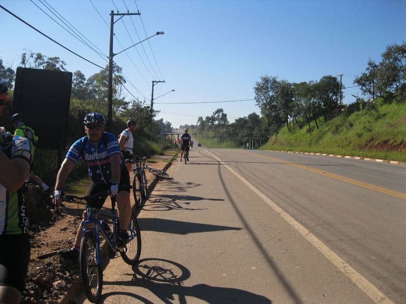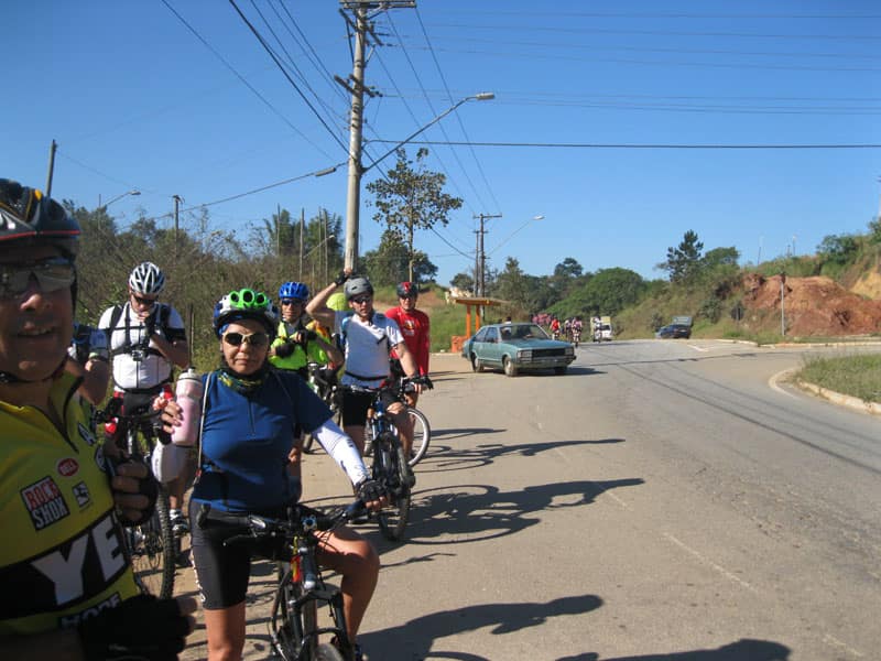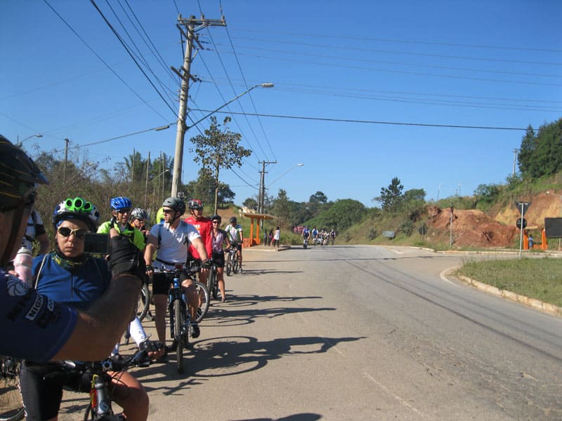 Fui pela Corifeu – Autonomistas – Romeiros saindo do Morumbi foi bem rápido, cheguei muito cedo e hoje era dia do XI Encontro Antigomobilismo de Santana de Parnaíba um evento da Federação Brasileira de Veiculos Antigos (FBVA) então o centro histórico estava com acesso restrito e tive que estacionar perto da Estrada dos Romeiros mesmo. Rodei um pouco pelo Largo da Matriz aguardando a chegada da galera, o Flávio que costuma pedalar com o Olavo de Sábado chegou logo em seguida. Quando a caravana chegou foi impedida de estacionar nas proximidades e indicaram um terreno da prefeitura a uns 500 metros do monumento como local seguro para estacionar, eu e o Flávio seguimos de bike para lá e em poucos minutos estavamos pedalando pela Estrada dos Romeiros com o pessoal.