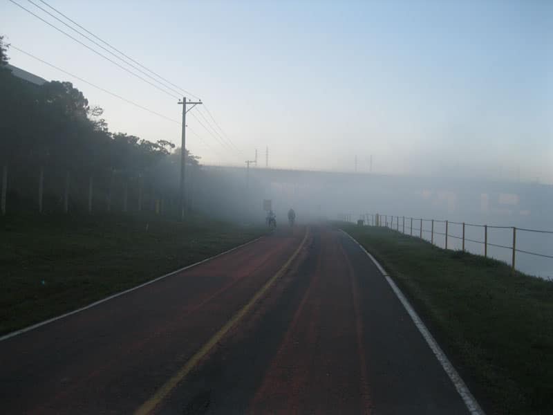 Cinco e meia da manhã abri a janela e dei de cara com um céu limpíssimo com direito a Lua e estrelas, Fui prá ciclovia com a adaptação no headset de novo, a crown race não serviu preciso achar uma com 3mm :(. Sem problemas mecânicos hoje dei uma apertada e consegui manter uma média de 32km/h em boa parte da ciclovia. Indo pra Interlagos encontrei o Gustavo Tavares que deve ter madrugado no pedal :), próximo ao autódromo tive a impressão que estava numa corrida de ciclocross na Inglaterra, um “Fog” que permitia enxergar alguns poucos metros a frente, de repente aparecia um vulto na névoa e surgia um ciclista na pista oposta.