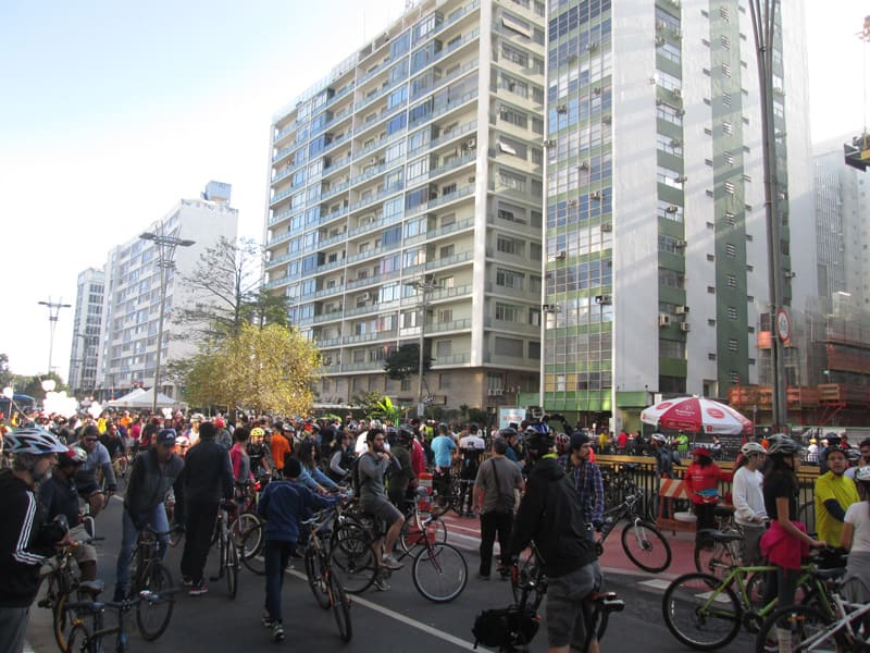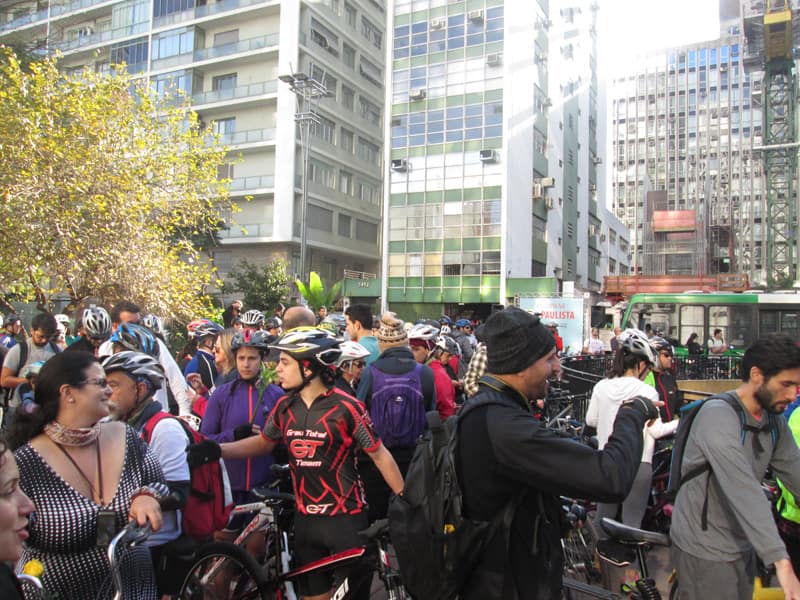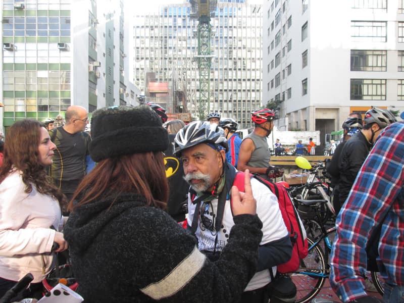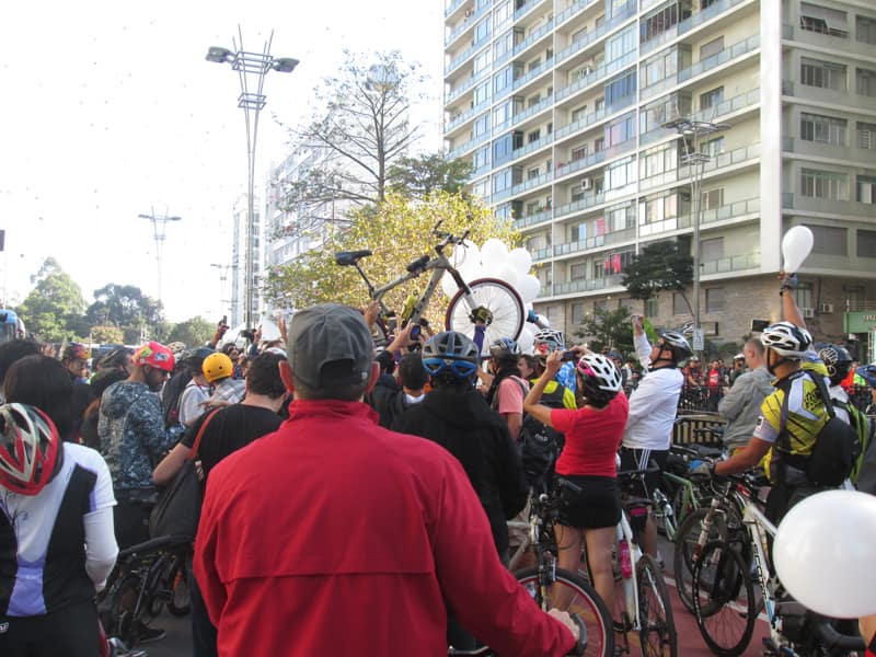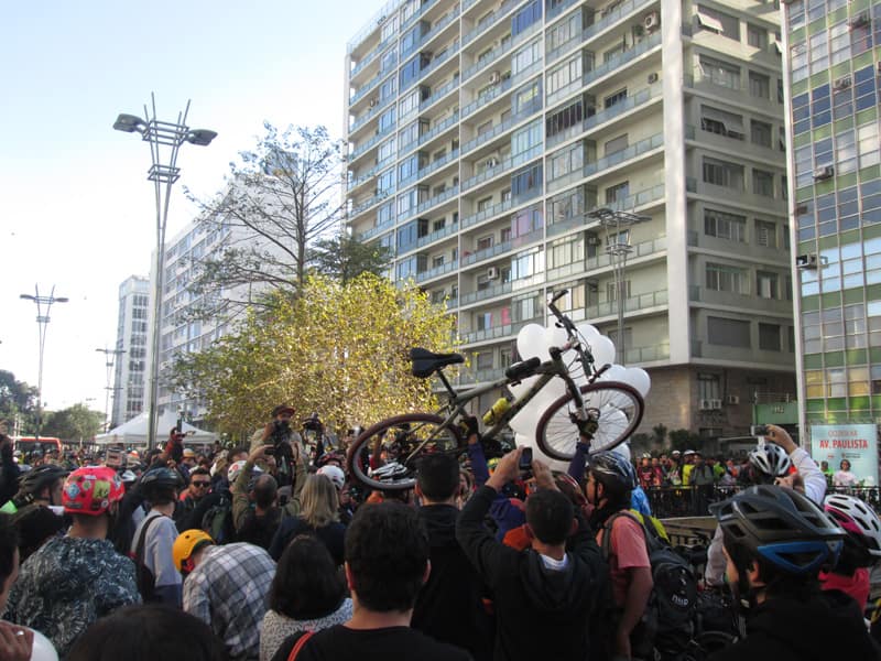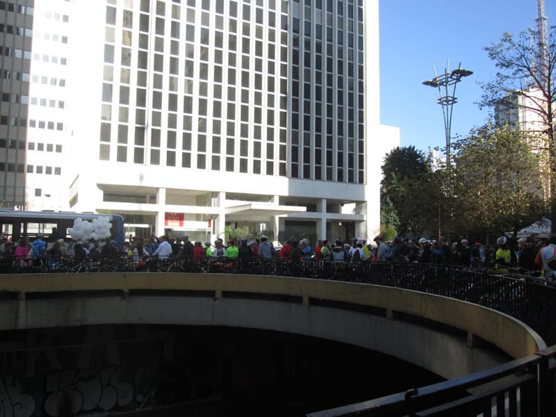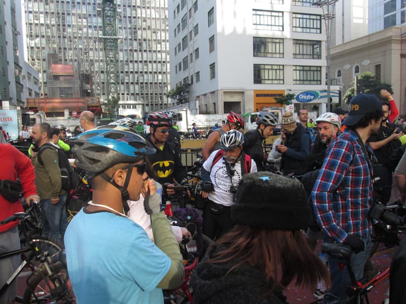 Subi pela Augusta e no trajeto só encontrei uma ciclista subindo, achei estranho e temi que o frio tivesse espantado a galera mas quando cheguei na praça do ciclista ela estava lotada. Foi um evento divertido, pacífico e consegui boas fotos. Durante a semana vou tentar fazer um giro pela ciclovia completa.