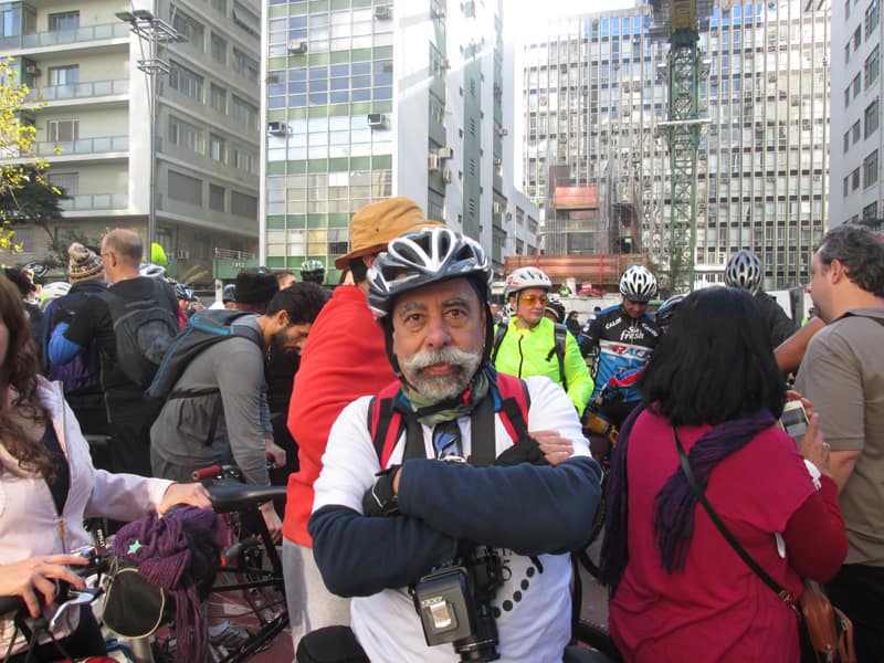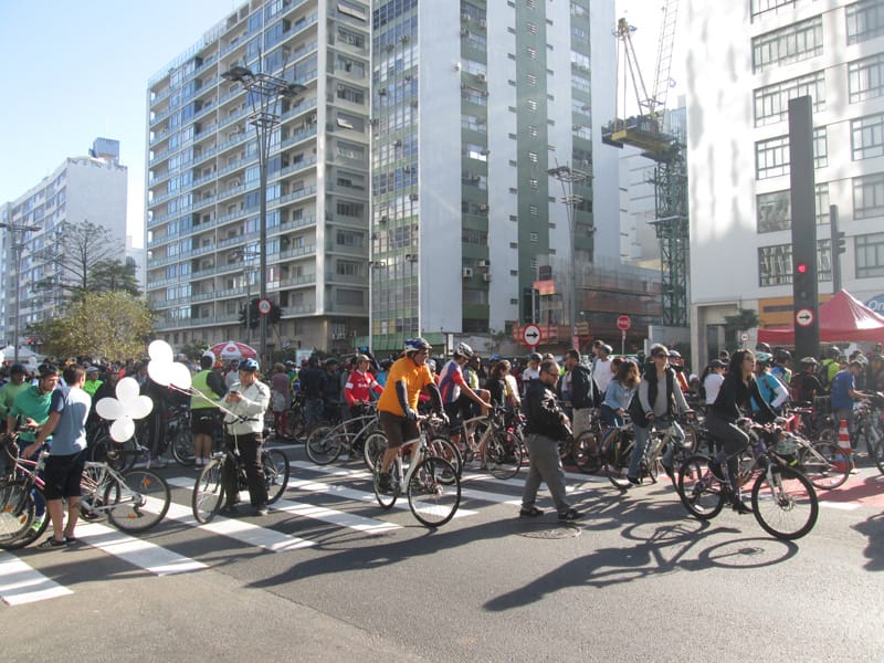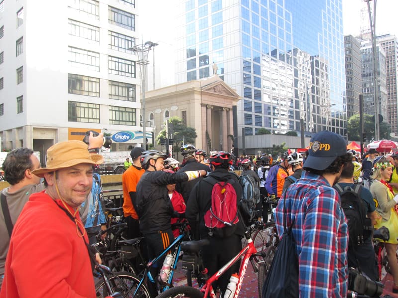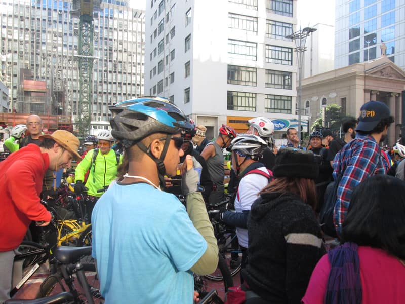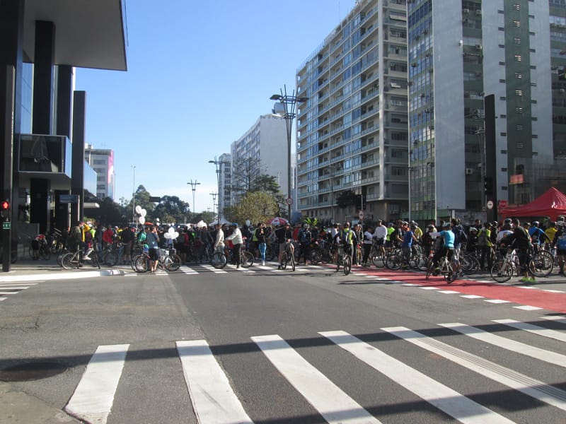 Subi pela Augusta e no trajeto só encontrei uma ciclista subindo, achei estranho e temi que o frio tivesse espantado a galera mas quando cheguei na praça do ciclista ela estava lotada. Foi um evento divertido, pacífico e consegui boas fotos. Durante a semana vou tentar fazer um giro pela ciclovia completa.