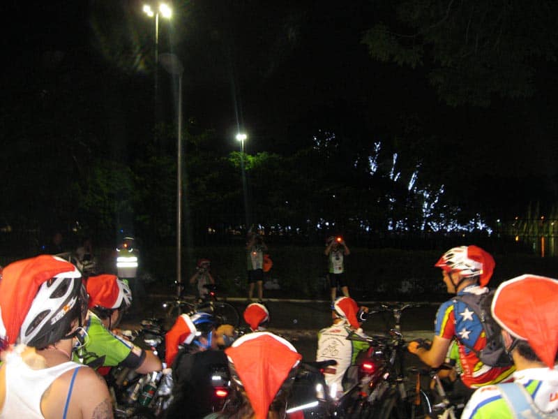 Fiz ontem a noite o passeio ciclístico de natal do Pedal da Vila Madalena, encontrei com o Serguinho e o Douglas na frente da Bandeirantes e chegamos na Vila Grano por volta de 21:00, ainda demorou um pouco pra sair, recebemos uma toca de Papai Noel e um Pisca Pisca por termos nos cadastrado no site do PVM para o passeio.