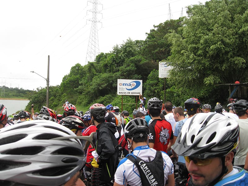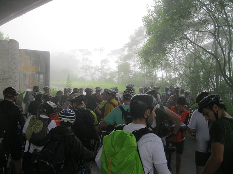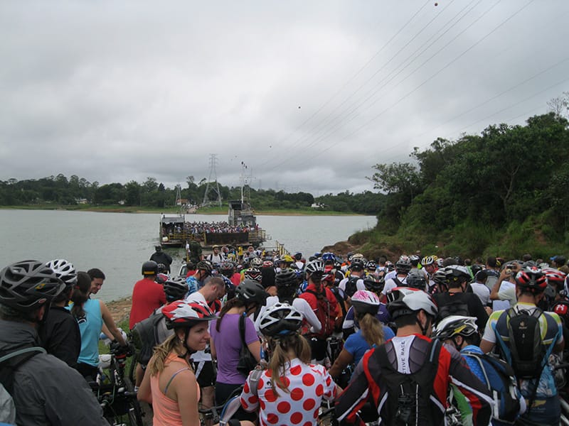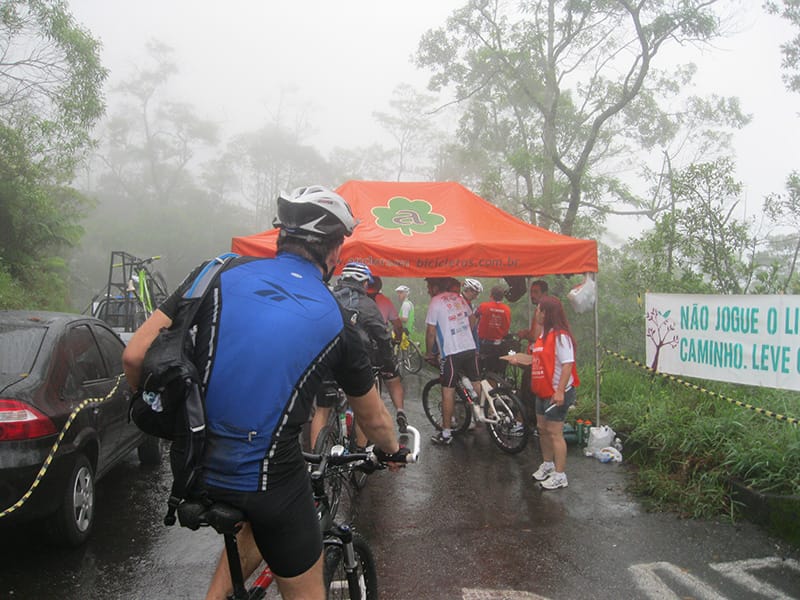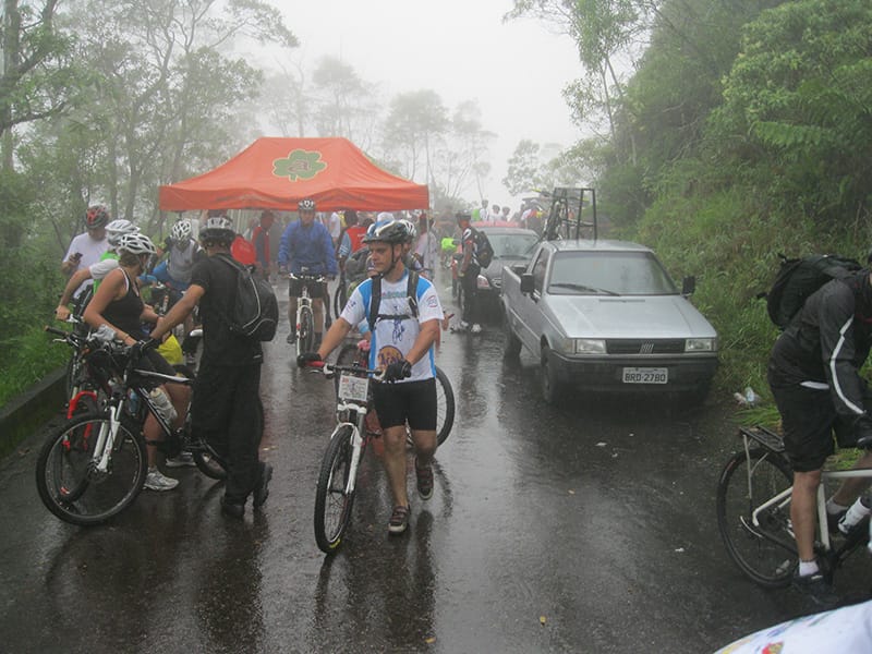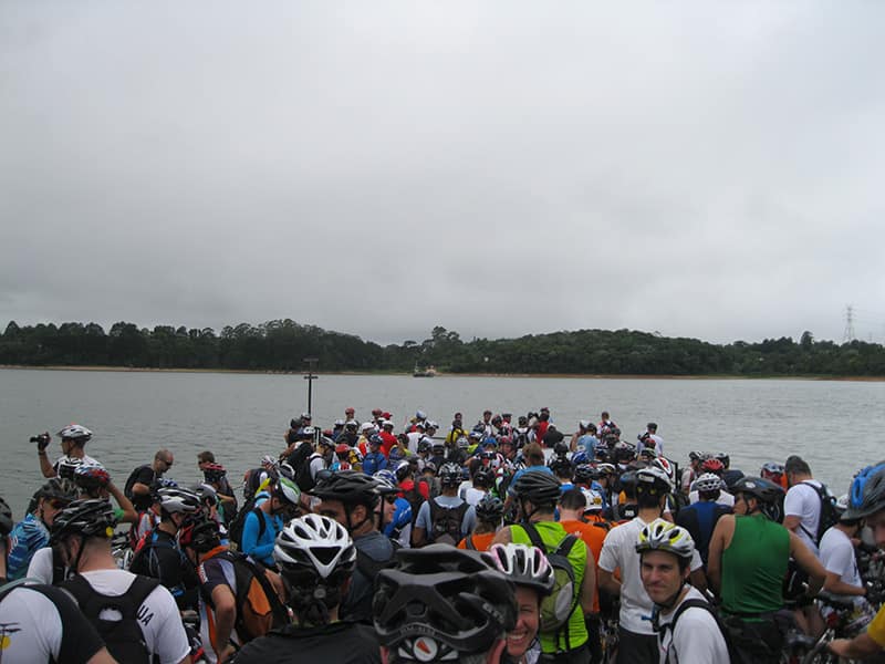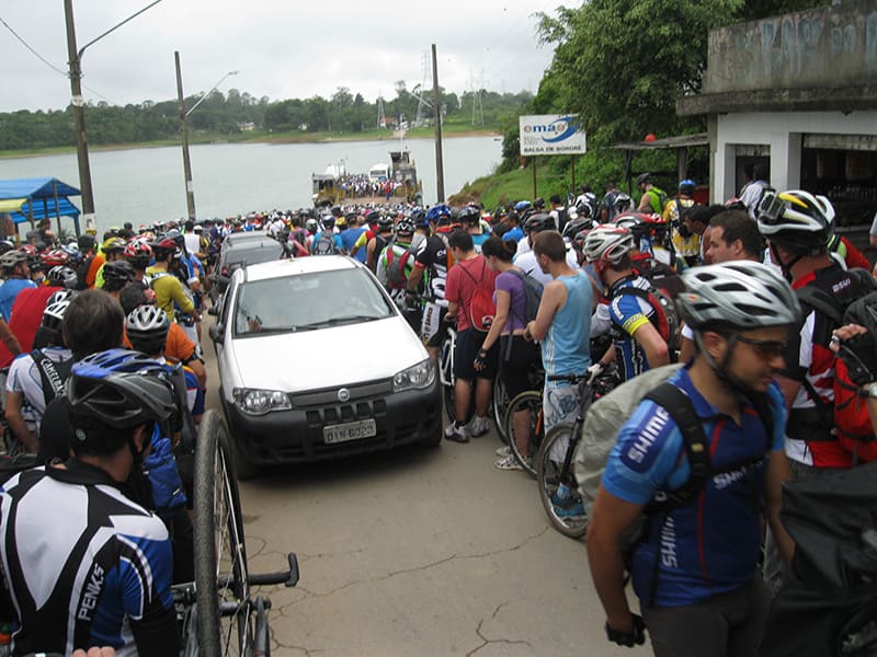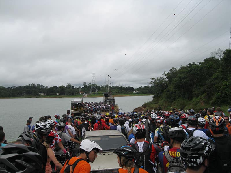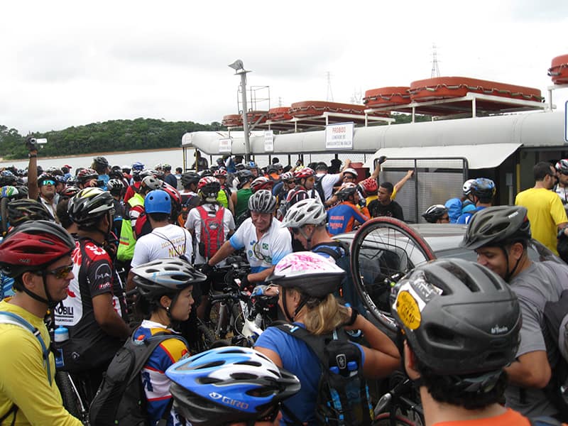 Acordei as 5:30 e estava abafado as seis tive a impressão que ia ter sol pela manhã, no fim além do sol não aparecer na serra só pegamos chuva até chegar em Cubatão. Nos encontramos na ciclovia as 7:00 vimos uma boa movimentação de ciclistas, mas nada parecido com o volume próximo a balsa do Bororê, eram centenas de bikes aguardando a travessia de balsa. Esse momento foi muito desorganizado além de não haver ninguém do Ciclo BR ou ao menos uma indicação de como seria feito o acesso, era cada um por si, resultado perdemos duas horas só para conseguir atravessar. Depois na segunda balsa perdemos mais meia hora. Essa parte do trajeto era sinalizada de forma bem precária e vi bastante gente indecisa em qual rumo tomar, como uma parte do grupo já havia feito as outras edições não tivemos problema mas deve ter alguém perdido lá pela ilha! Quando chegamos próximos a entrada do parque chovia bastante, tivemos que parar para identificação e nessa parte o pessoal do Ciclo BR verificava quem estava cadastrado ou não. Por incrível que pareça eles seguravam quem tinha o número do cadastro online e pedia para passar quem ainda não havia feito o cadastro. Ficamos mais 45 minutos nesse entrave mesmo sabendo o número da inscrição!