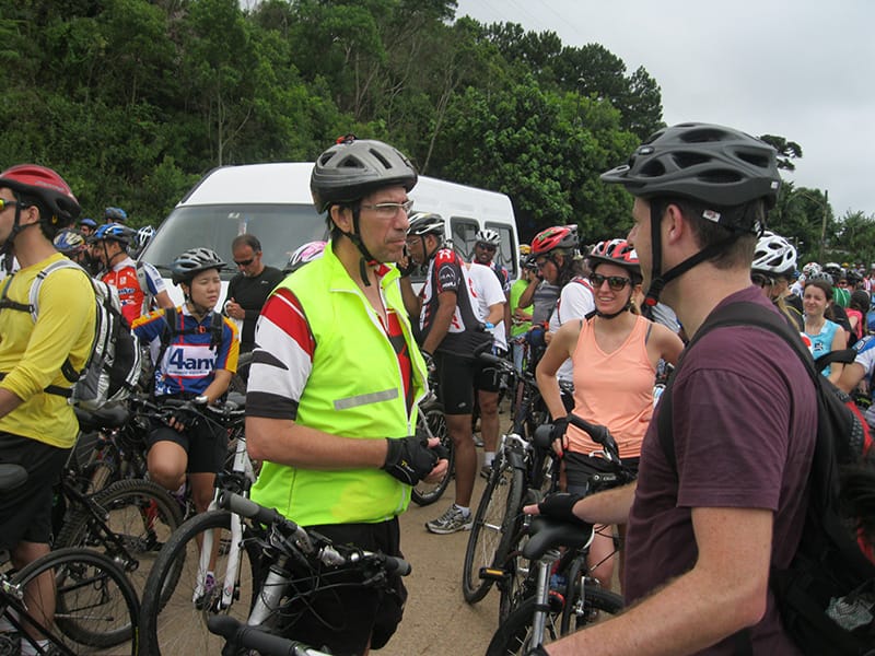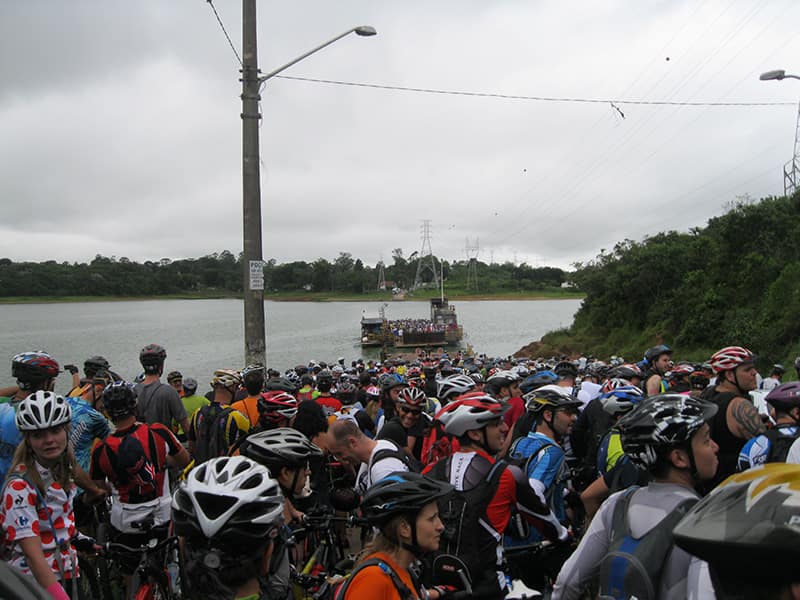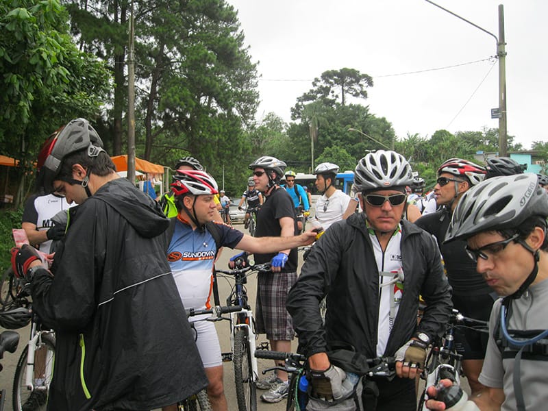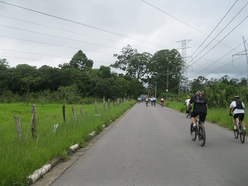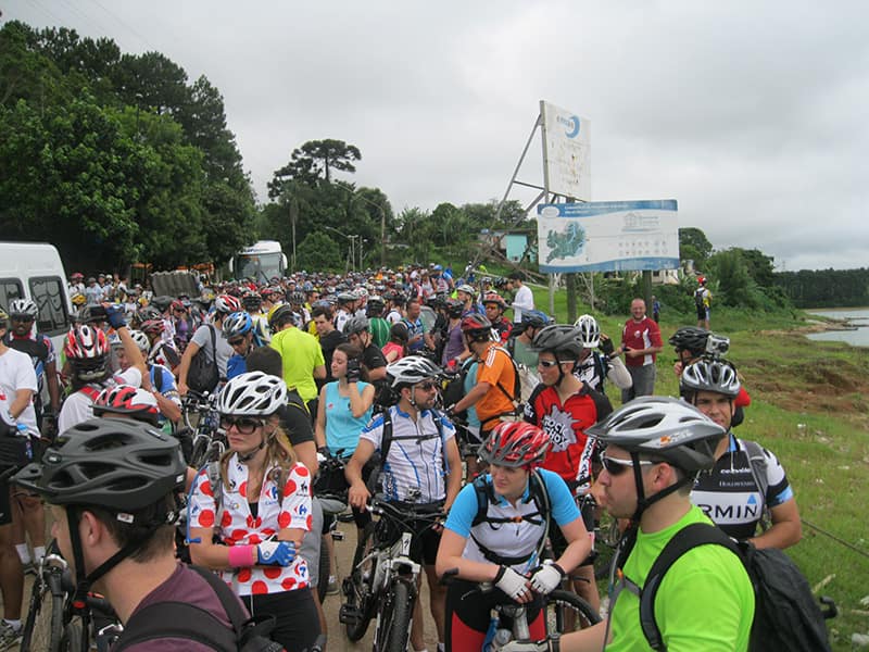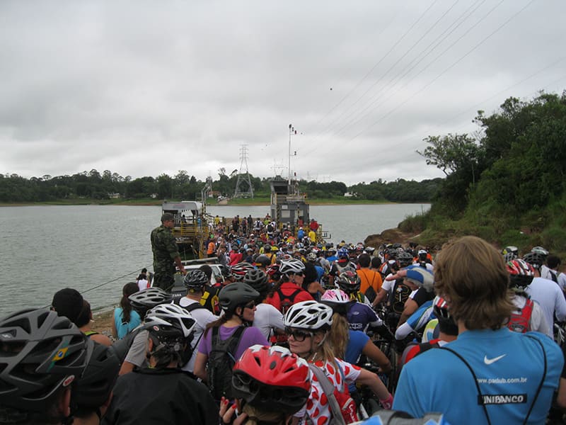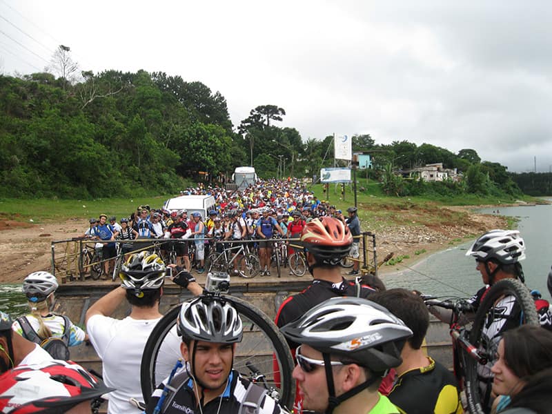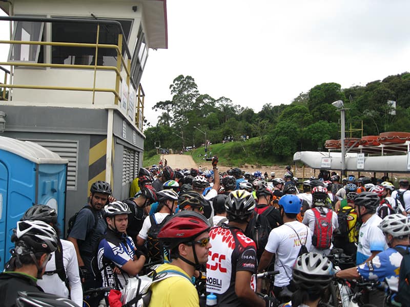 Acordei as 5:30 e estava abafado as seis tive a impressão que ia ter sol pela manhã, no fim além do sol não aparecer na serra só pegamos chuva até chegar em Cubatão. Nos encontramos na ciclovia as 7:00 vimos uma boa movimentação de ciclistas, mas nada parecido com o volume próximo a balsa do Bororê, eram centenas de bikes aguardando a travessia de balsa. Esse momento foi muito desorganizado além de não haver ninguém do Ciclo BR ou ao menos uma indicação de como seria feito o acesso, era cada um por si, resultado perdemos duas horas só para conseguir atravessar. Depois na segunda balsa perdemos mais meia hora. Essa parte do trajeto era sinalizada de forma bem precária e vi bastante gente indecisa em qual rumo tomar, como uma parte do grupo já havia feito as outras edições não tivemos problema mas deve ter alguém perdido lá pela ilha! Quando chegamos próximos a entrada do parque chovia bastante, tivemos que parar para identificação e nessa parte o pessoal do Ciclo BR verificava quem estava cadastrado ou não. Por incrível que pareça eles seguravam quem tinha o número do cadastro online e pedia para passar quem ainda não havia feito o cadastro. Ficamos mais 45 minutos nesse entrave mesmo sabendo o número da inscrição!