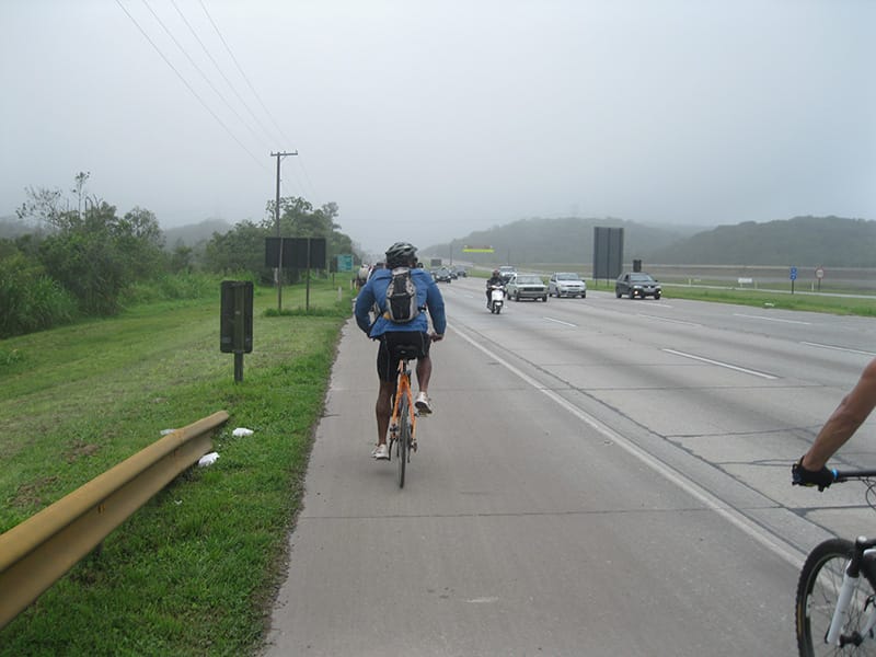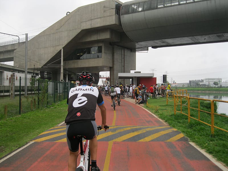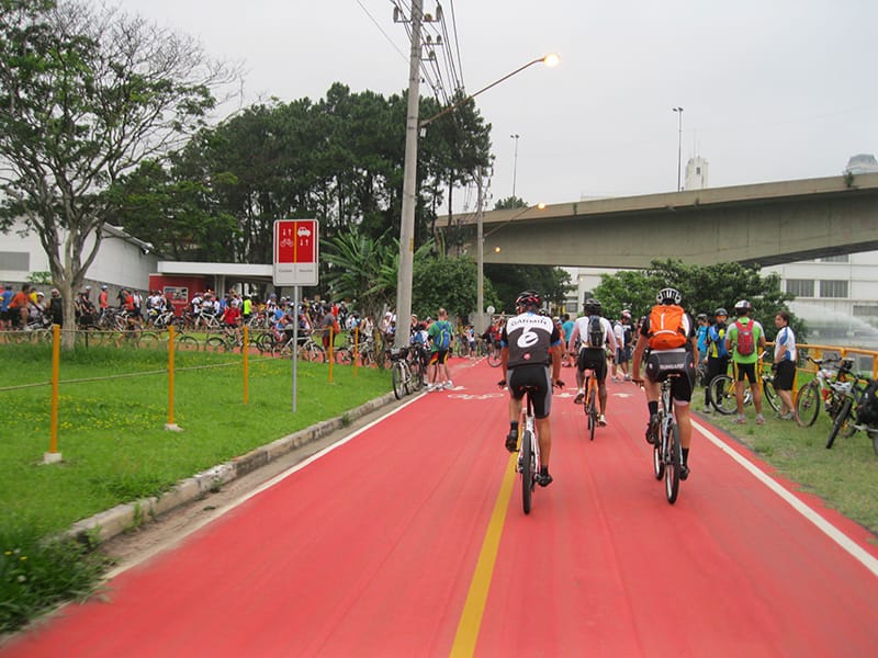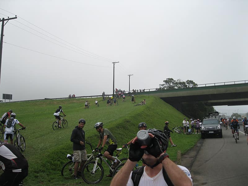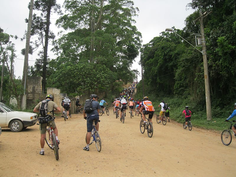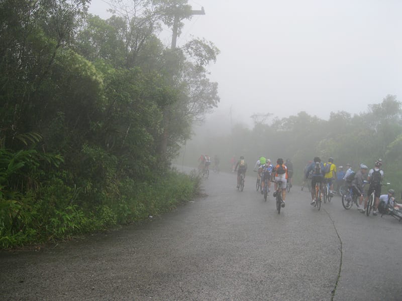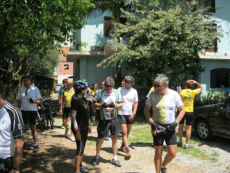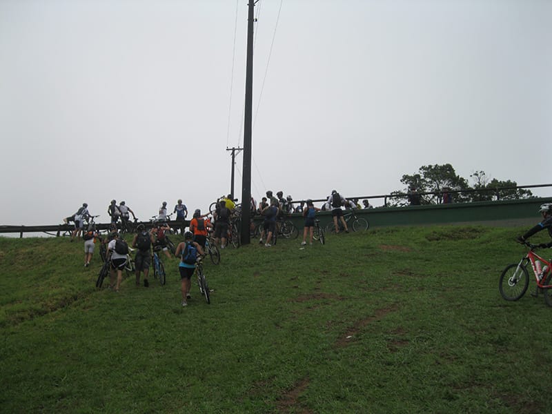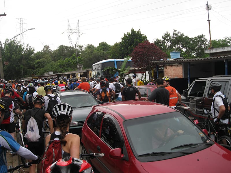 Acordei as 5:30 e estava abafado as seis tive a impressão que ia ter sol pela manhã, no fim além do sol não aparecer na serra só pegamos chuva até chegar em Cubatão. Nos encontramos na ciclovia as 7:00 vimos uma boa movimentação de ciclistas, mas nada parecido com o volume próximo a balsa do Bororê, eram centenas de bikes aguardando a travessia de balsa. Esse momento foi muito desorganizado além de não haver ninguém do Ciclo BR ou ao menos uma indicação de como seria feito o acesso, era cada um por si, resultado perdemos duas horas só para conseguir atravessar. Depois na segunda balsa perdemos mais meia hora. Essa parte do trajeto era sinalizada de forma bem precária e vi bastante gente indecisa em qual rumo tomar, como uma parte do grupo já havia feito as outras edições não tivemos problema mas deve ter alguém perdido lá pela ilha! Quando chegamos próximos a entrada do parque chovia bastante, tivemos que parar para identificação e nessa parte o pessoal do Ciclo BR verificava quem estava cadastrado ou não. Por incrível que pareça eles seguravam quem tinha o número do cadastro online e pedia para passar quem ainda não havia feito o cadastro. Ficamos mais 45 minutos nesse entrave mesmo sabendo o número da inscrição!