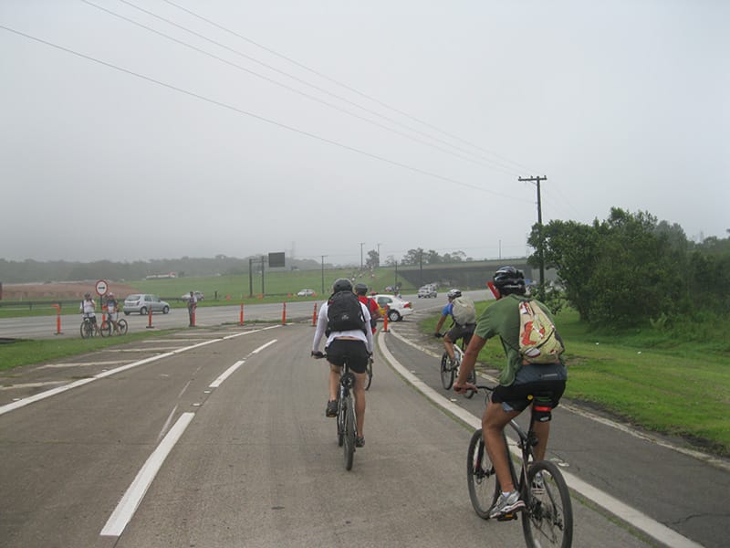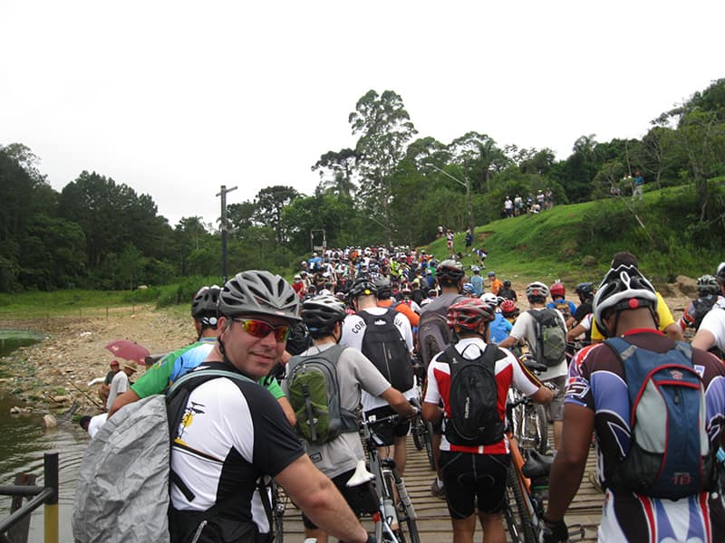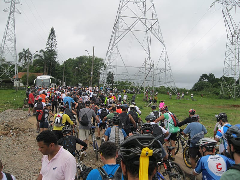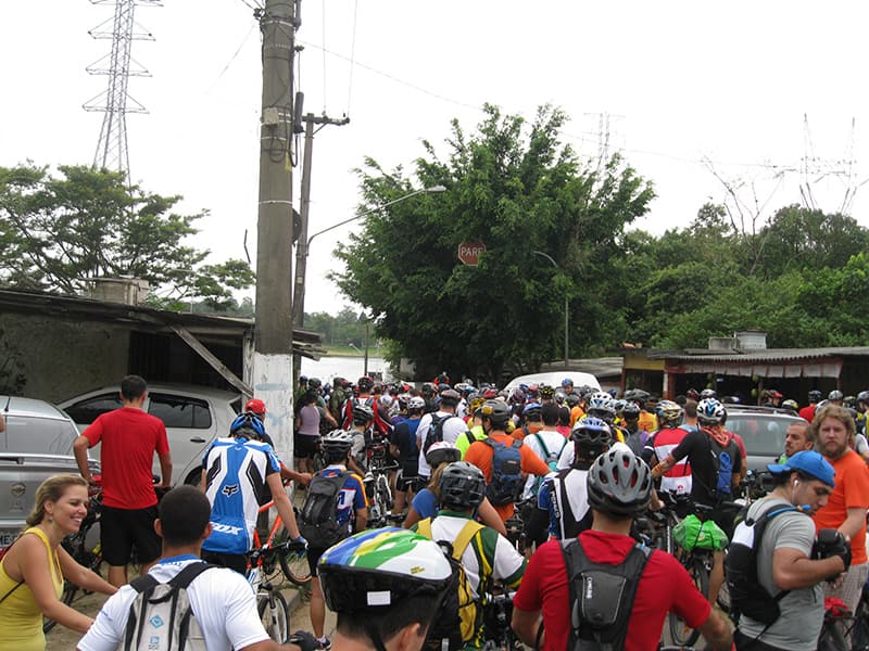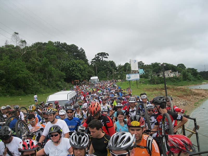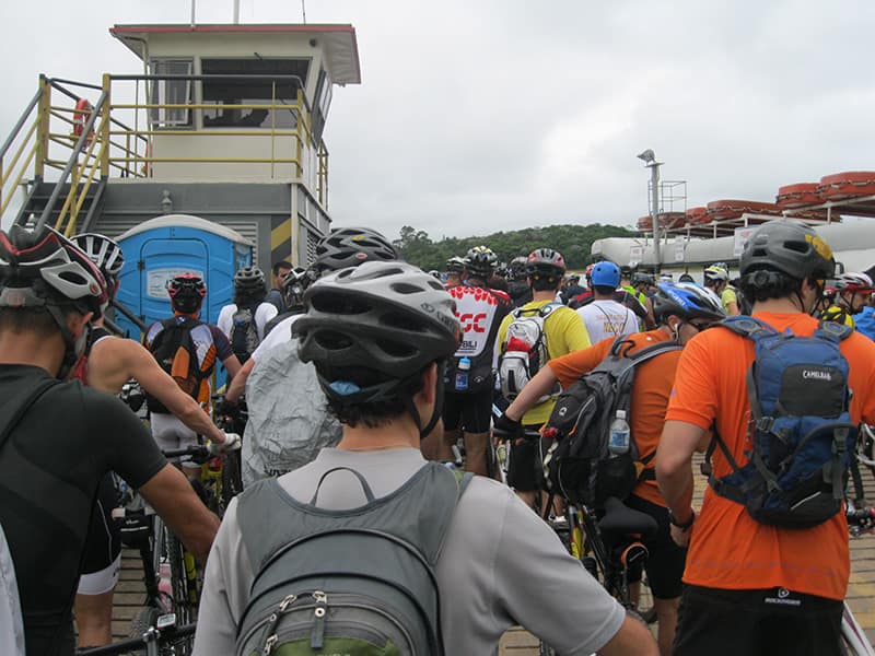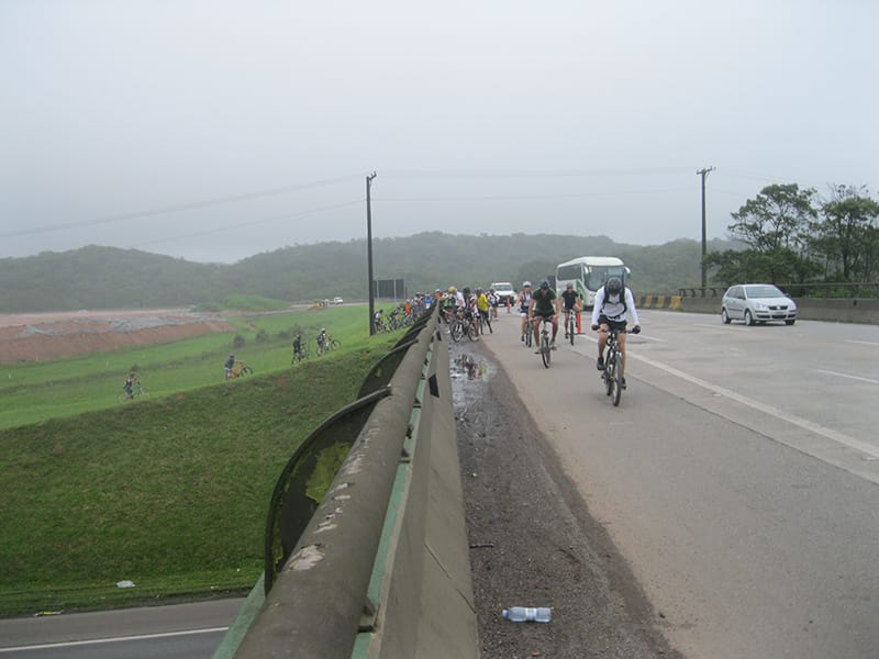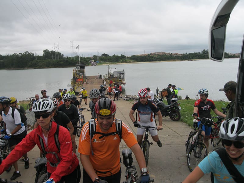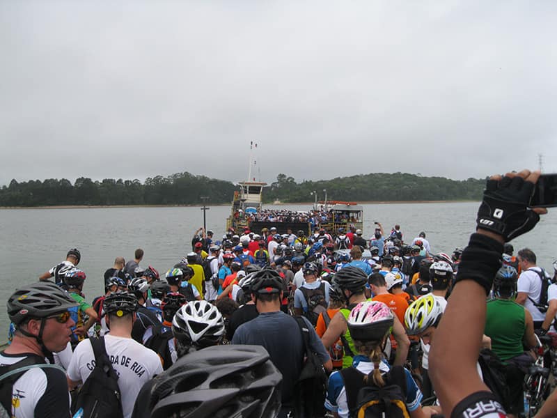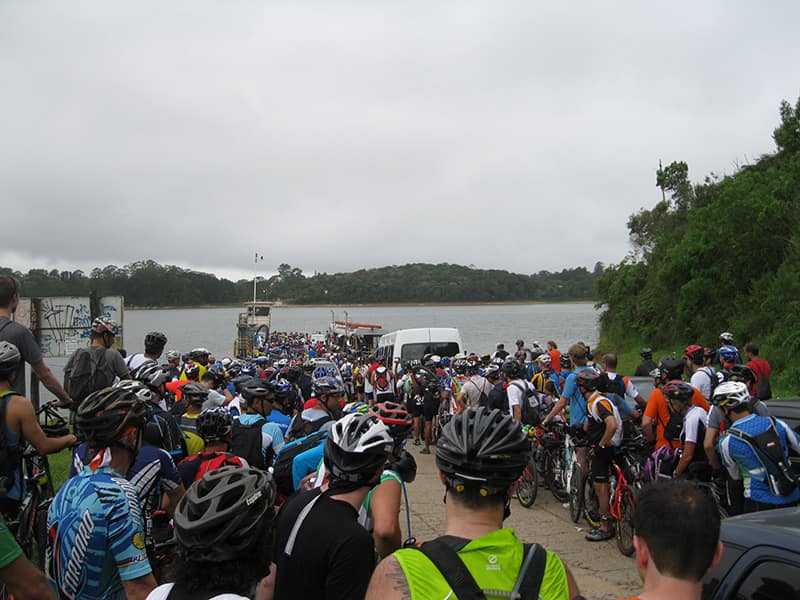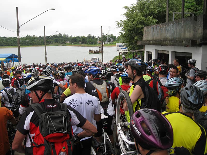 Acordei as 5:30 e estava abafado as seis tive a impressão que ia ter sol pela manhã, no fim além do sol não aparecer na serra só pegamos chuva até chegar em Cubatão. Nos encontramos na ciclovia as 7:00 vimos uma boa movimentação de ciclistas, mas nada parecido com o volume próximo a balsa do Bororê, eram centenas de bikes aguardando a travessia de balsa. Esse momento foi muito desorganizado além de não haver ninguém do Ciclo BR ou ao menos uma indicação de como seria feito o acesso, era cada um por si, resultado perdemos duas horas só para conseguir atravessar. Depois na segunda balsa perdemos mais meia hora. Essa parte do trajeto era sinalizada de forma bem precária e vi bastante gente indecisa em qual rumo tomar, como uma parte do grupo já havia feito as outras edições não tivemos problema mas deve ter alguém perdido lá pela ilha! Quando chegamos próximos a entrada do parque chovia bastante, tivemos que parar para identificação e nessa parte o pessoal do Ciclo BR verificava quem estava cadastrado ou não. Por incrível que pareça eles seguravam quem tinha o número do cadastro online e pedia para passar quem ainda não havia feito o cadastro. Ficamos mais 45 minutos nesse entrave mesmo sabendo o número da inscrição!