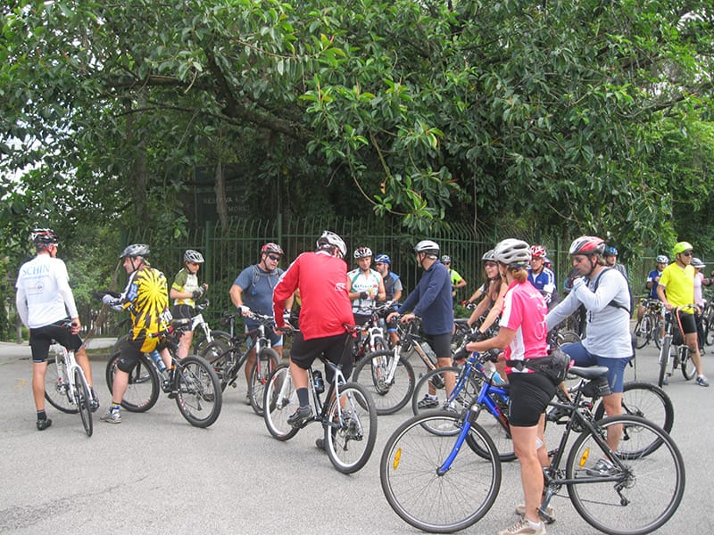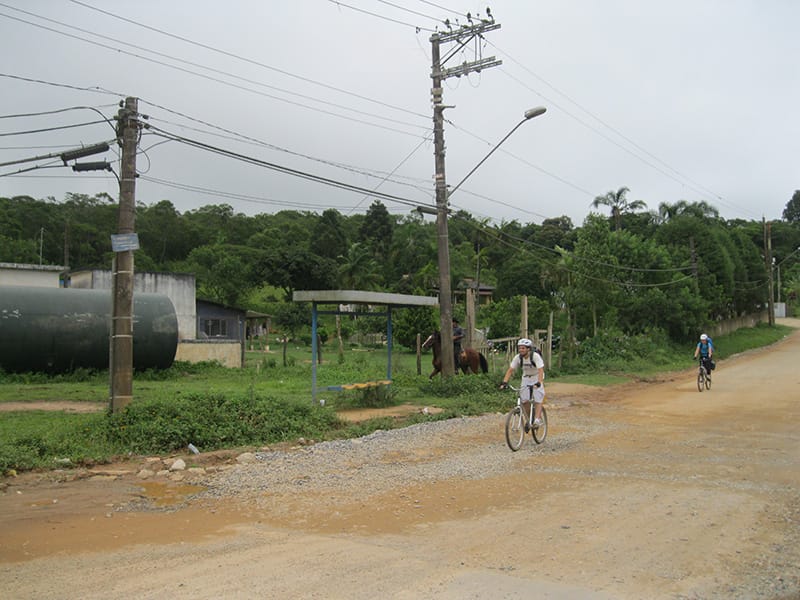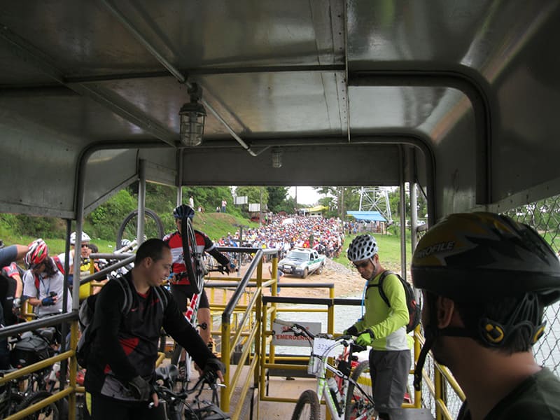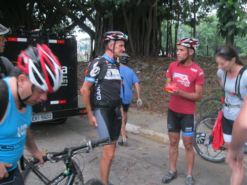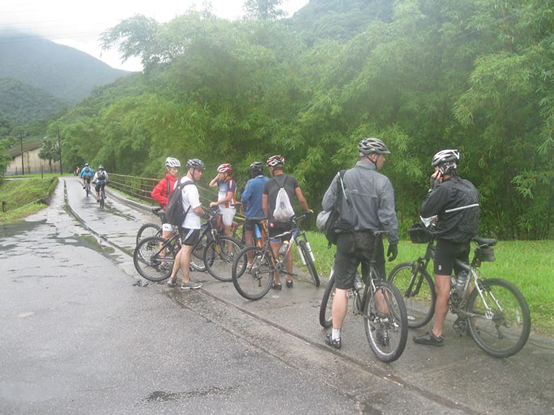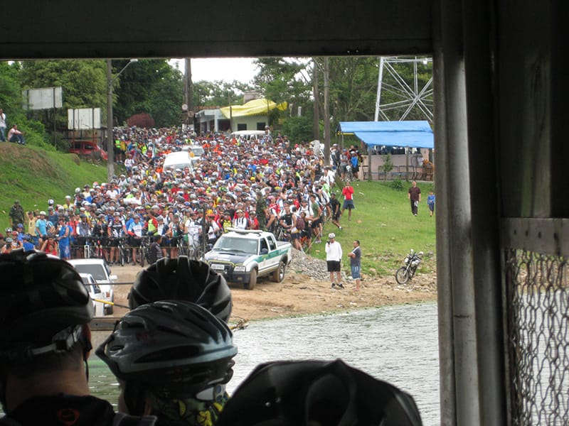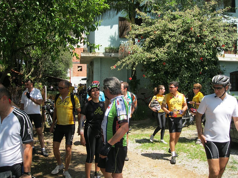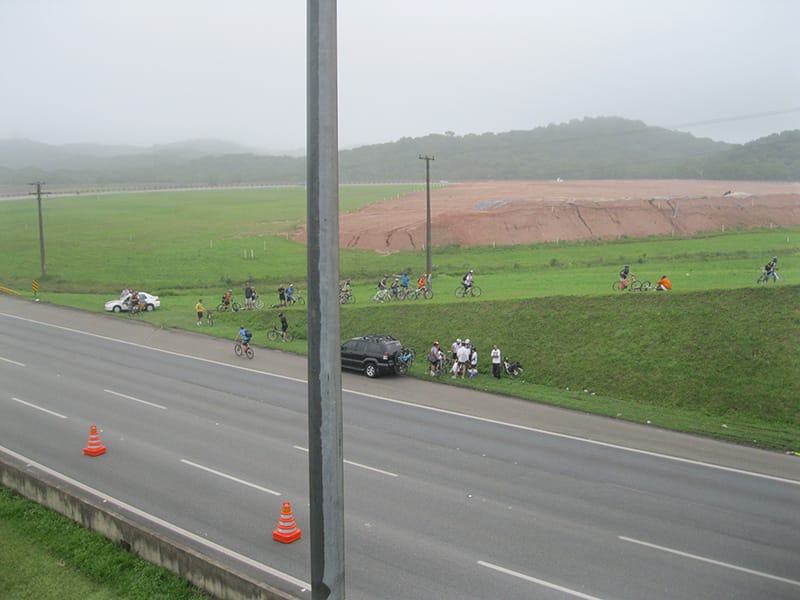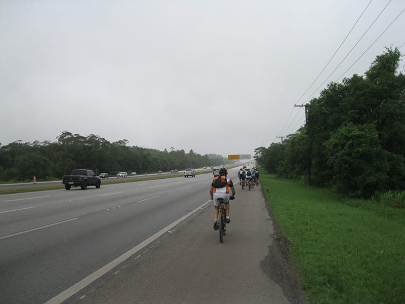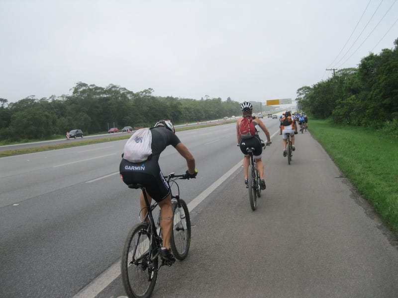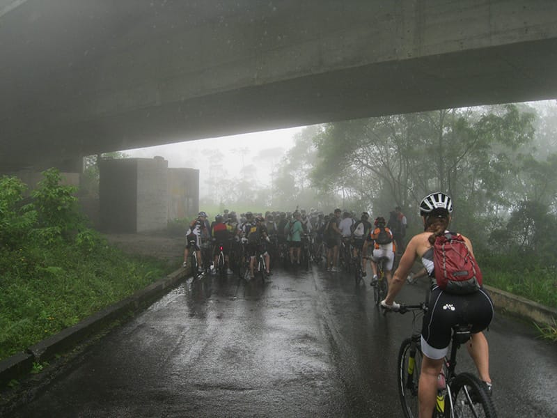 Acordei as 5:30 e estava abafado as seis tive a impressão que ia ter sol pela manhã, no fim além do sol não aparecer na serra só pegamos chuva até chegar em Cubatão. Nos encontramos na ciclovia as 7:00 vimos uma boa movimentação de ciclistas, mas nada parecido com o volume próximo a balsa do Bororê, eram centenas de bikes aguardando a travessia de balsa. Esse momento foi muito desorganizado além de não haver ninguém do Ciclo BR ou ao menos uma indicação de como seria feito o acesso, era cada um por si, resultado perdemos duas horas só para conseguir atravessar. Depois na segunda balsa perdemos mais meia hora. Essa parte do trajeto era sinalizada de forma bem precária e vi bastante gente indecisa em qual rumo tomar, como uma parte do grupo já havia feito as outras edições não tivemos problema mas deve ter alguém perdido lá pela ilha! Quando chegamos próximos a entrada do parque chovia bastante, tivemos que parar para identificação e nessa parte o pessoal do Ciclo BR verificava quem estava cadastrado ou não. Por incrível que pareça eles seguravam quem tinha o número do cadastro online e pedia para passar quem ainda não havia feito o cadastro. Ficamos mais 45 minutos nesse entrave mesmo sabendo o número da inscrição!