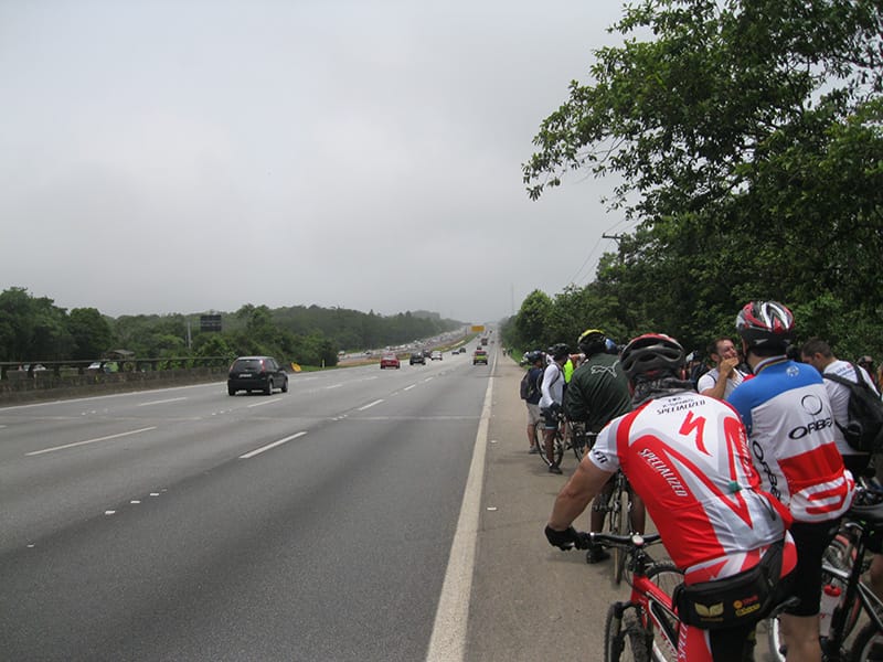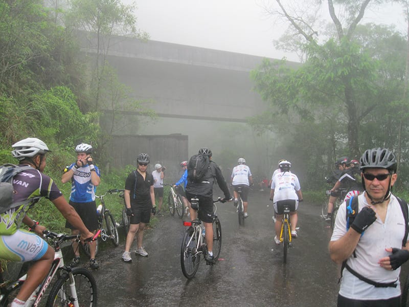 Com muita chuva e neblina descemos devagar, nas partes mais críticas da chegada no litoral algumas viaturas garantiam a segurança dos ciclistas e por volta de 16:00 estavamos chegando em Cubatão. Seguimos para Santos para encontrar a Van com carreta que contratamos para nos pegar as 16:00!!!
